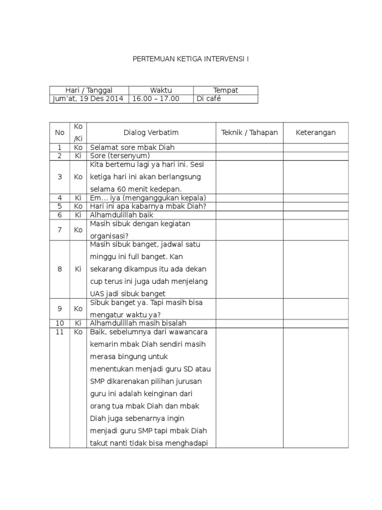 Contoh verbatim konseling individu. Laki laki tempattgl lahir. Contoh verbatim dengan pendekatan behaviour menggunakan tekni relaksasi dan disentisasi sistematik untuk mengatasi rasa kecemasan yang berlebihan. 18 tahun agama. Nah itu namanya konseling vitojadi saya jelaskan sedikit ya mengenai konseling itu apakonseling ini bertujuan untuk membantu konseli memecahkan masalahnya dan pilihan terakhir ditangan konseli itu sendiri dan azas yang digunakan antara lain pertama azas kerahasiaan dimana permasalahan anda hanya kita berdua yang mengetahuinya yang kedua azas keterbukaan dimana konseli atau anda. Doni kusuma nama samaran jenis kelamin. Tegal17 febuari 1997 pekerjaan.