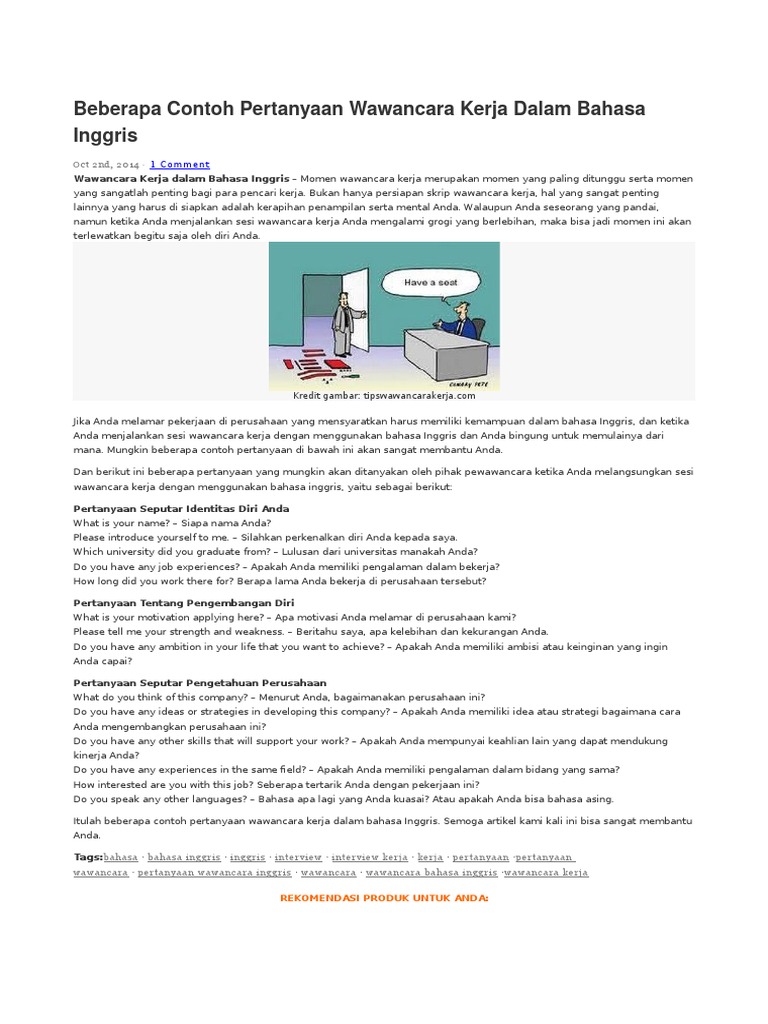 Contoh wawancara bahasa inggris. Orang orang dihantui rasa takut akan melakukan kesalahan pada saat wawancara. 15 pertanyaan interview bahasa inggris plus arti dan contoh jawabannya saat wawancara kerja dengan bahasa inggris pertanyaan interview bahasa inggris pasti akan menjadi momok utama terutama kalau kamu tidak begitu mahir berbahasa inggris. Contoh dialog wawancara kerja dalam bahasa inggris melakukan interview atau wawancara adalah salah satu hal yang paling menegangkan bagi kebanyakan orang. Contoh dialog atau percakapan bahasa inggris saat wawancara kerja terbaik teman teman sedang mencari sebuah gambaran sebuah interview kerja dalam bahasa inggris. Sobat pembaca pada posting kali ini saya akan share contoh percakapan interview wawancara kerja dalam bahasa inggrisinterview atau wawancara kerja dalam bahasa inggris biasa didapat jika perusahaan memberi persyaratan pelamar harus bisa berbahasa inggris atau pelamar sendiri yang menerangkan bahwa ia menguasai bahasa bahasa inggris. Contoh wawancara kerja dalam bahasa inggris contoh dialog interview kerja dalam bahasa inggris interview kerja adalah salah satu tahap yang paling menegangkan bagi sebagian orang.