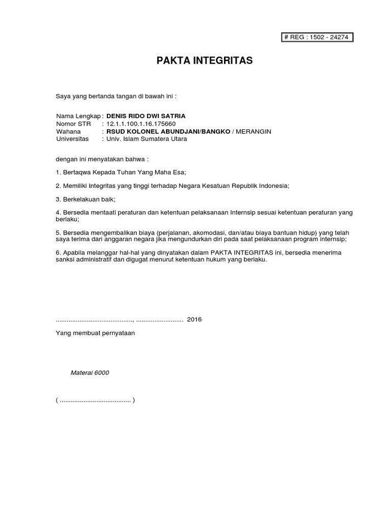 Menumbuhkan keterbukaan dan kejujuran serta mempelancar tugas yang berkualitas efektif dan akuntabell dan termasuk untuk mewujudkan pribadi yang bertanggung jawab dan. Pakta integritas saya yang bertanda tangan dibawah ini. Dapodikdasmen pakta integritas berikut ini adalah dapodikdasmen pakta integritas yang bisa anda download secara gratis di website kami. Download modul guru pembelajar 20162017 lengkap semua jenjang pendidikan. Dalam rangka pengurusan sertifikasi alatperangkat telekomunikasi di direktorat jenderal sumber. Untuk itu langsung saja baca dibawah ini contoh surat pakta integritas tersebut.