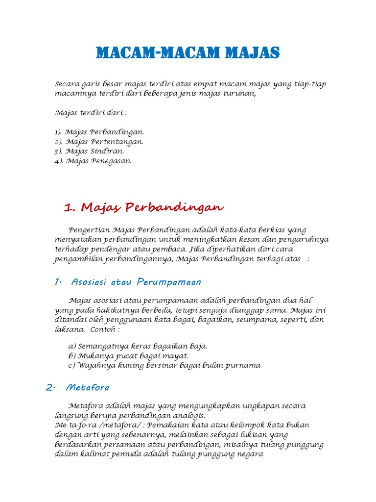 Di bawah ini akan kami paparkan semua informasi tentang jenis jenis majas. Arti jenis jenis dan contoh majas lengkap pengertian majas dan macam macam majas artikel ini menjelaskan secara lengkap tentang pengertian majas atau gaya bahasa yang digunakan dalam karya sastra apa saja jenis jenis majas dan beberapa contoh gaya bahasa yang digunakan dalam bahasa indonesia. Majas perbandingan pertentangan sindiran dan penegasan. Majas sering sekali digunakan dalam penulisan pada suatu karya sastra salah satu diantaranya yaitu puisi dan prosa. Majas adalah gaya bahasa yang digunakan penulis untuk menyampaikan sebuah pesan secara imajinatif dan kias. Ya majas adalah materi yang cukup sering dibahas mulai dari jenjang pendidikan sd smp smasmk bahkan hingga tingkat perkuliahan.